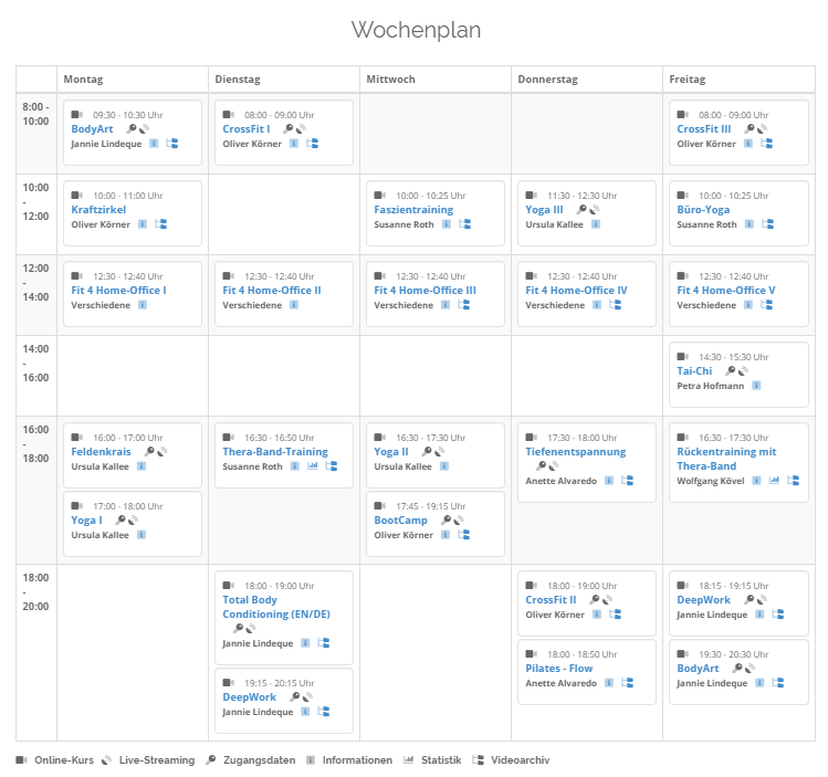 Für jede Organisation bieten wir die individuelle, passende Lösung: Online-Kurse, Video-Archiv, Rückentraining, Kurztraining im Büro, Entspannung, Ernährung oder auch Motivationswettbewerbe.